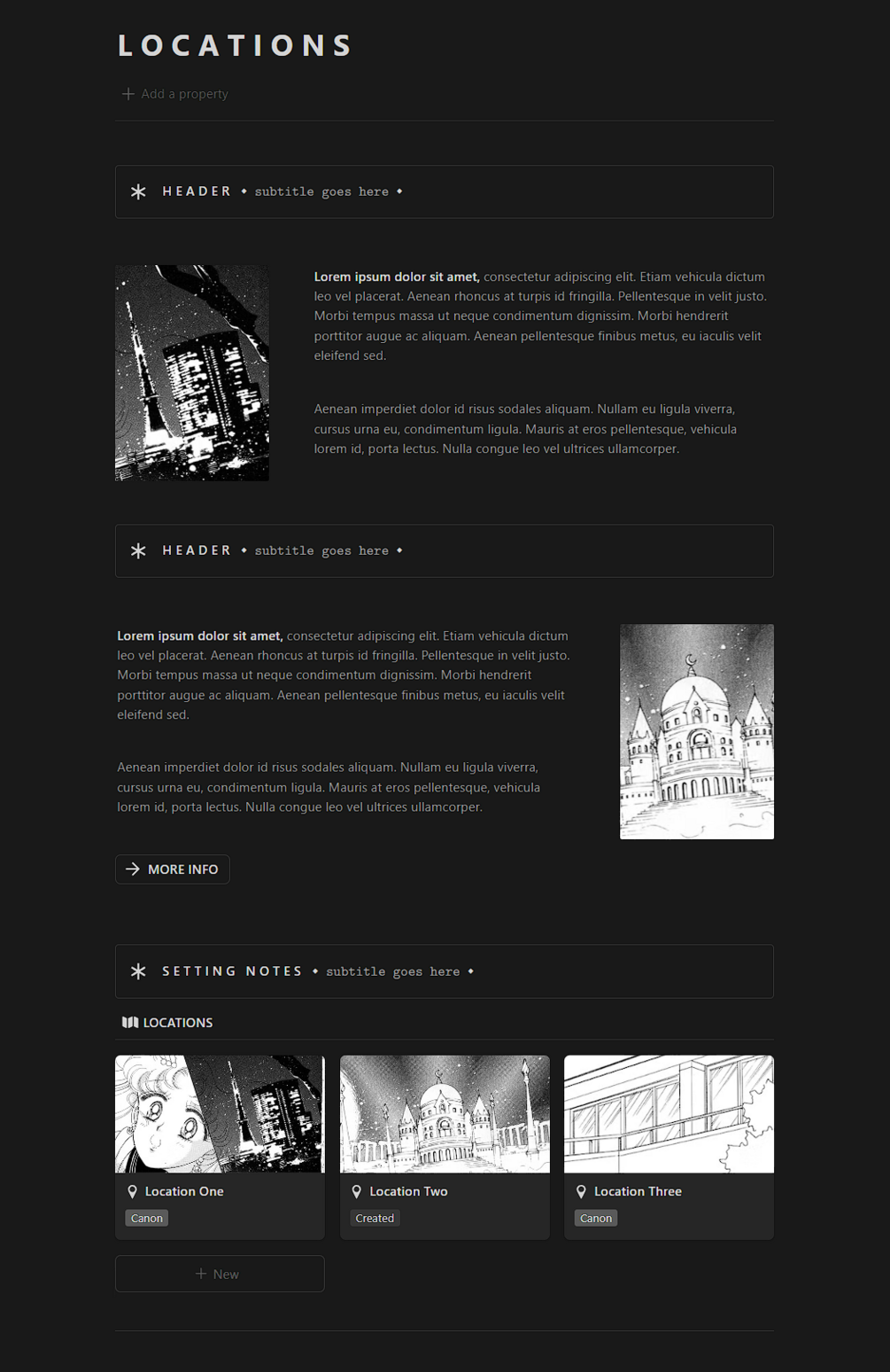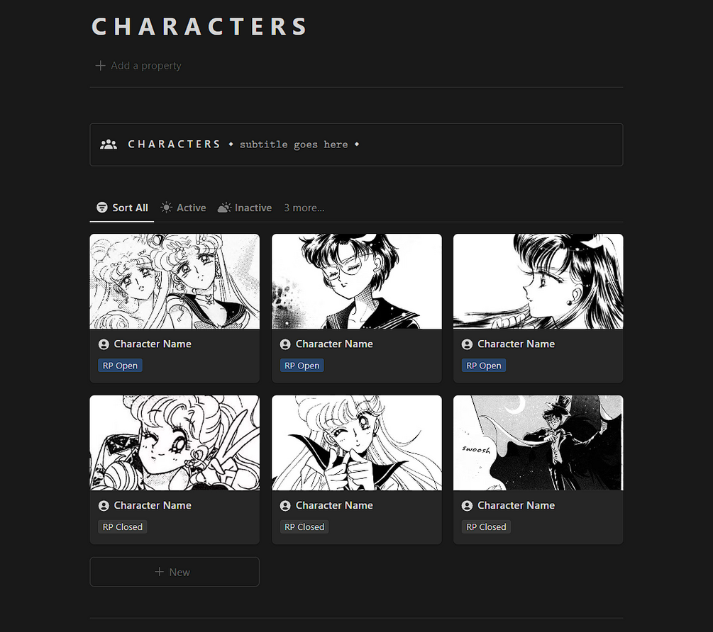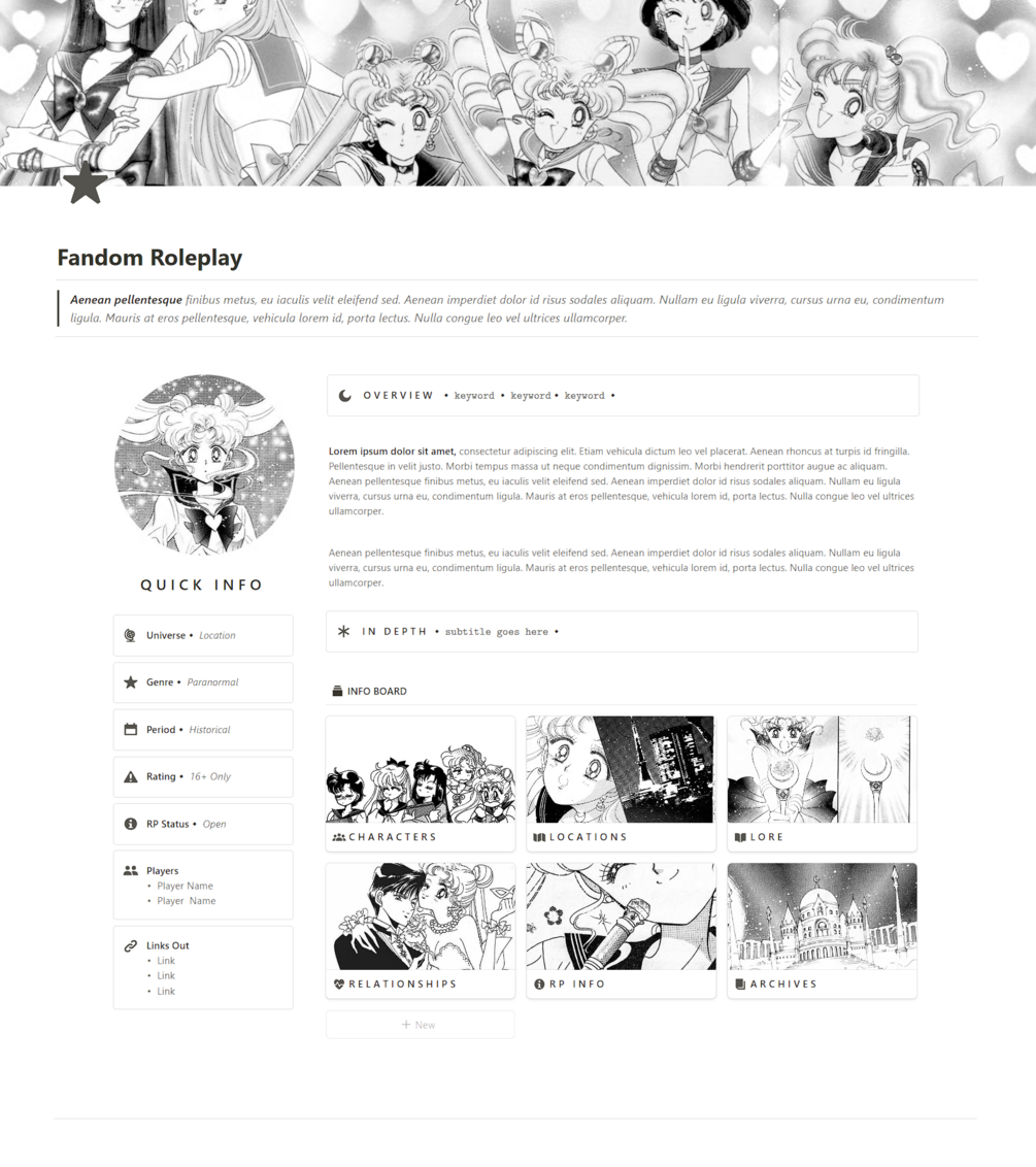 There is a Database section to host your Character information, your custom or expanded Locations, Relationships, RP information and Archives for your notes or written works. You could easily adapt this workspace for other purposes however - Notion makes everything as versatile as you need it to be!
