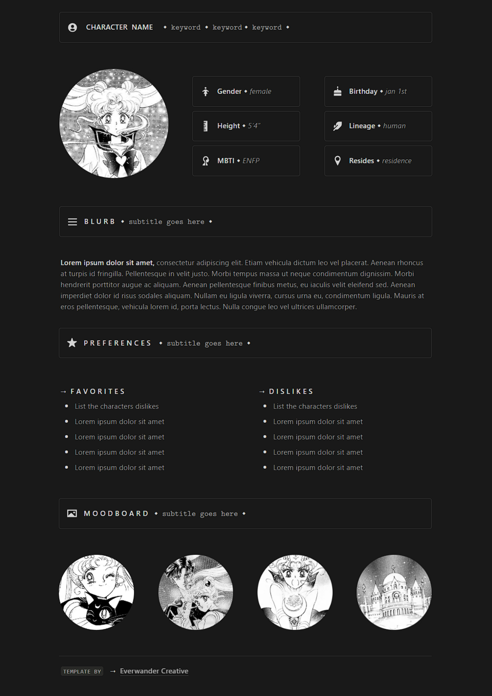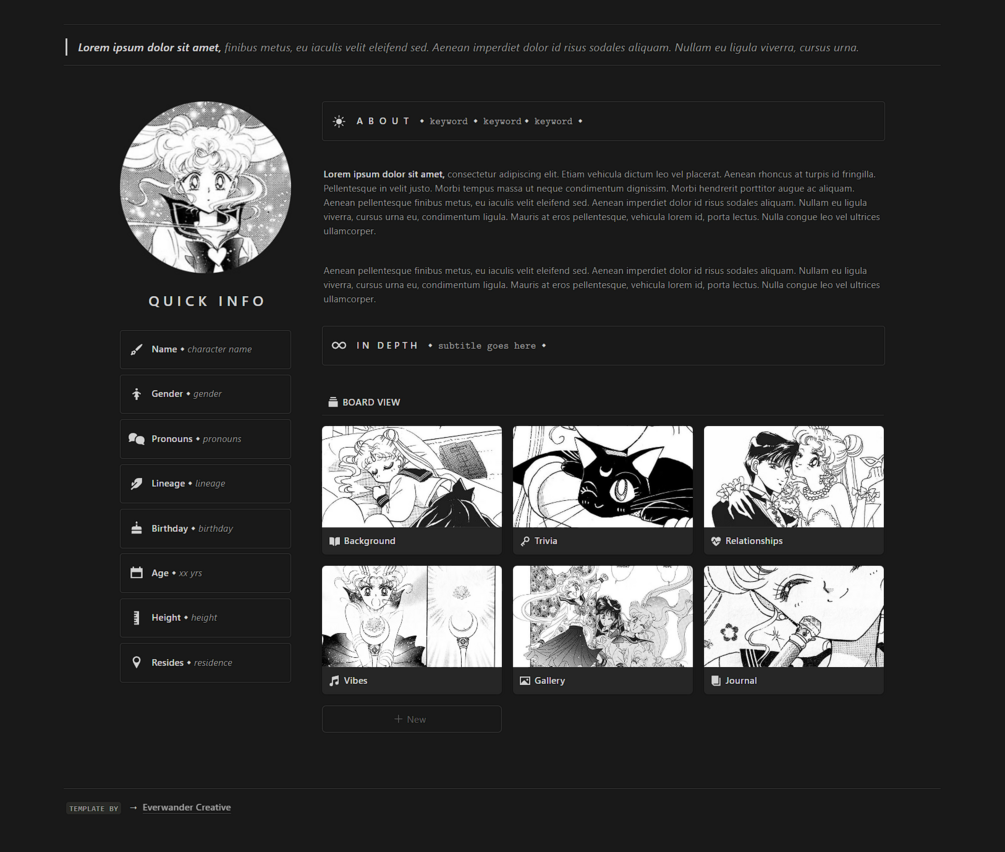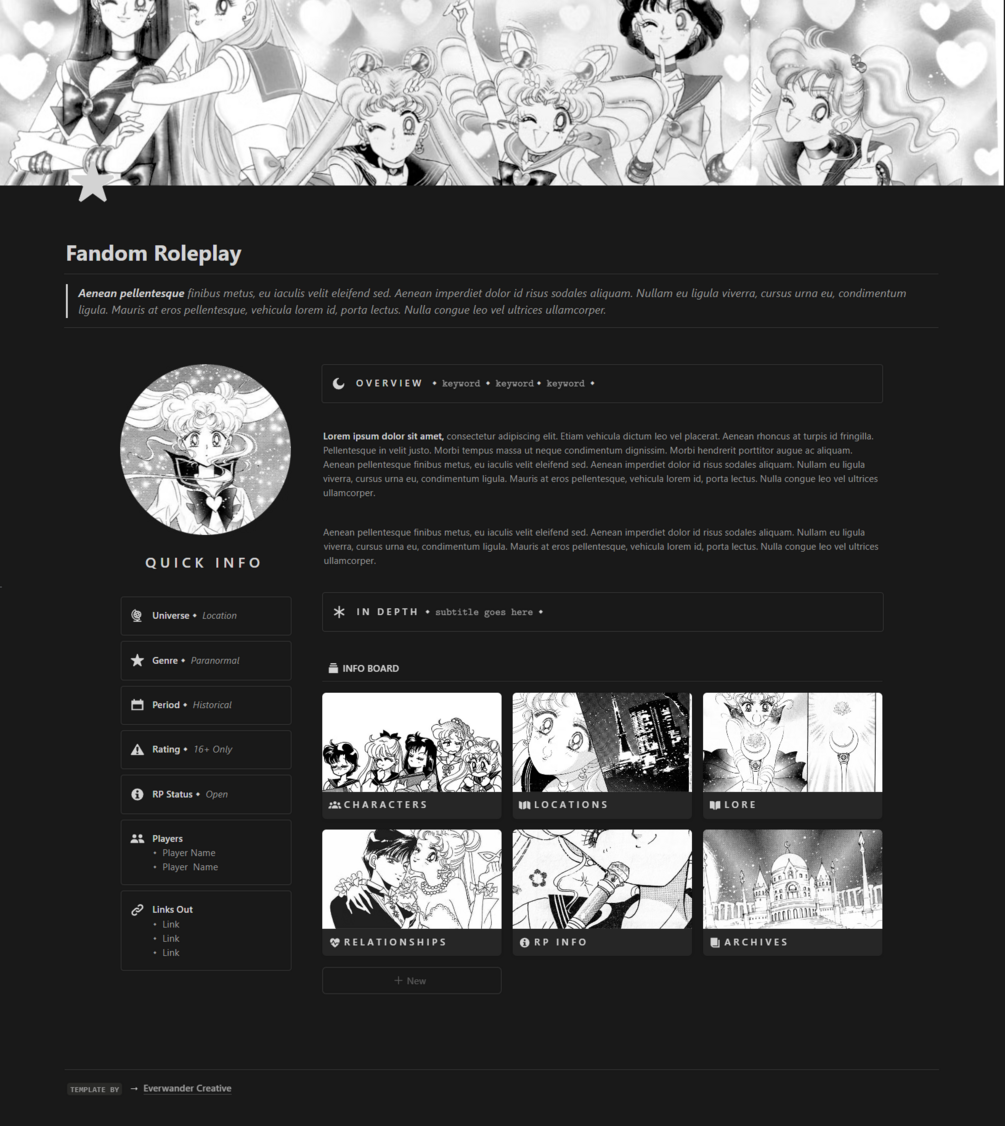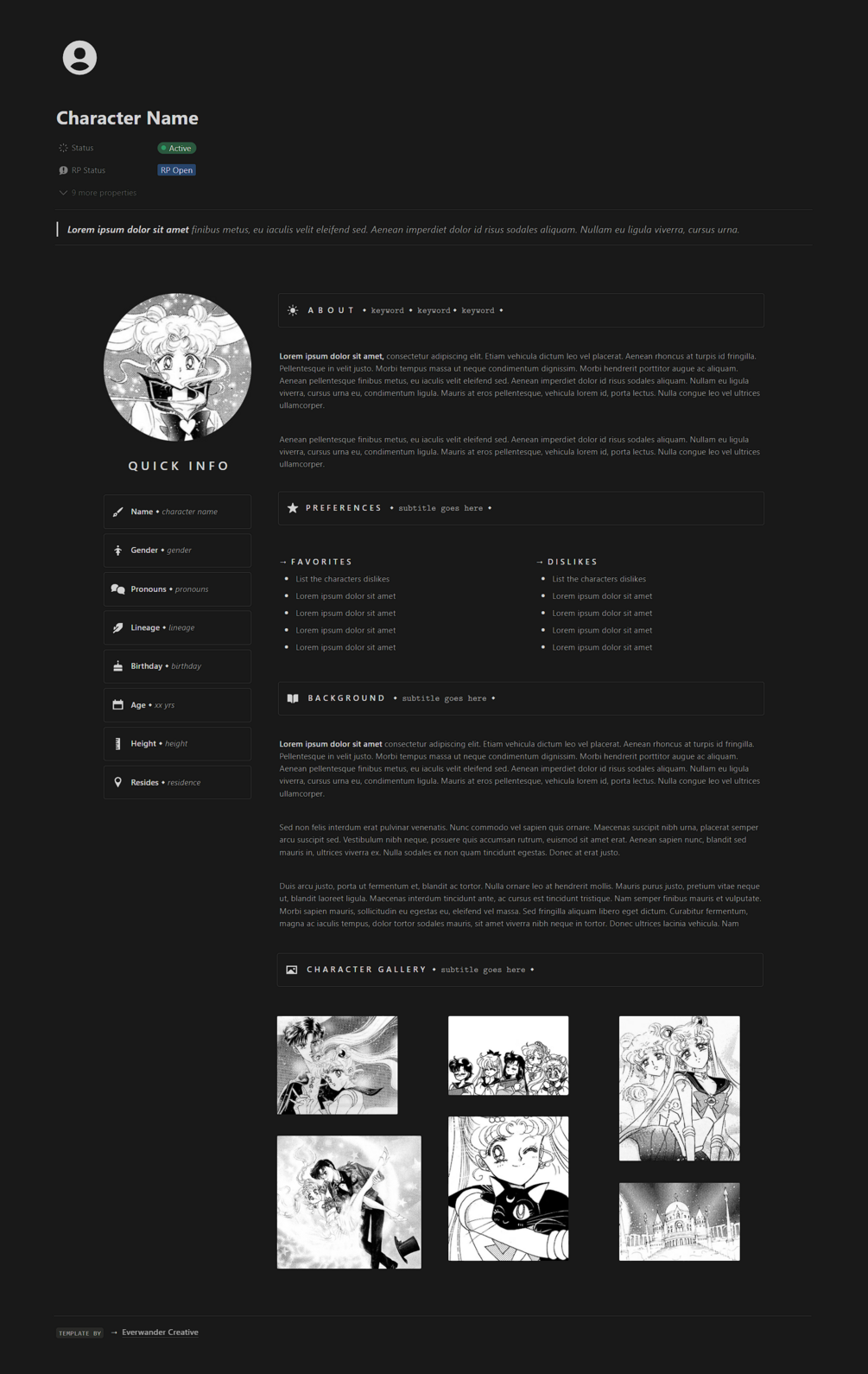 This Notion Template was created for hosting Character, Role Play, and Story information that is based in a pre-existing universe or fandom! Designed in Dark Mode, works just as well in Light Mode.